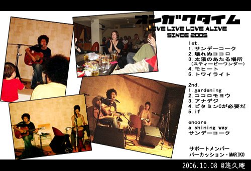 さっきまで騒いでいたダチも チューニングするいしざきともきの姿をジーッと見ている。 ここのビールには鎮静効果があるのかと疑ってみたが どうやらいしざきともきに対する期待が彼等を黙らせたようだ… 今回オンガクタイムのライブレポートを 担当することになったyopeiです。 僕自身としては今回で三度目となるオンガクタイム。 ダチの晴れ舞台を1人で見るのはつまらない。 仲間は多いほうがいいに決まっている。 今回は前回からは大幅アップの大勢の仲間。 こいつらがちゃんと唄を聴いていられるのだろうか? 飲んで暴れやしないだろうか? 酒は飲んでも飲まれず、歌に酔って下さいと祈りたくなる。 いしざきともきのライブの前と間と後はDJGO。 つまり大半の時間はDJGOのピッチングである。 いつも僕のストライクゾーンをズバズバ攻めてくる。 毎度毎度、曲名を知りたくて尋ねにいくのだが いつも深酒しているため合っているのかなと少々不安になる。 しかし色男と色女には滅法弱い僕、 ならばよしと信じたくなるから色男はずるい。 いかしたDJ、もちろんあなたは名投手。 DJGOの選曲か?いしざきともきの唄への渇望か? ライブタイム前からビールがどんどん入ってくる、下戸なのに。 ビールのおかわりを注文したところで 演奏スペースの辺りが動き出した。 ![]() 毎回ライブ前から期待をしているMCの後、 サンデーコークが始まった。 レポートを書いていてなんだがぼくは音楽にコンプレックスがある。 ゆえにその音を論じる言葉を持っていない。 ライブについて僕が述べるとすれば……。 DJGOの愛息子、心君の反応。 まもなく2歳の子供にサクラをしてくれと頼んだ所で その意味がわかるはずもなく、 彼はその時その場にいた誰よりも素直な反応を僕らに見せてくれた。 音を感じて、体を揺らせて、手を叩いて、ニコニコと。 天真爛漫な心君とは反対の存在、 つまり僕らは日々の生活の中で成長していつの間にか 心君とは全く異なる存在となっている。 きっと昔は出来たであろう”感じる”が出来ない。 聴くという行為をしようとし過ぎる。 その僕らを黙らせ、感じさせ、笑顔にさせるいしざきともき。 彼の唄にはそれだけの力がある。 世代、環境、状況を超え皆を笑顔にする力が…。 そして今回のオンガクタイムからの変化、 いしざきともきが金棒を手にいれたこと。 そう、パーカッションのまりこさんの加入である。 ギターと声とパーカッションの融合に どこからともなく甘く、そしてきつ過ぎることのない心地よい香り、 僕が好きな香り、そう金木犀の香りのようなものを感じたのだった。 ![]() 帰り道、ふと思った。 昼過ぎに起きてぼーっと時間を過ごす、それも休日の過ごし方。 応援しているダチのなにかを感じへらへらと笑いながら酒を飲む、 それも休日の過ごし方。 どーせ笑うならダチ見て笑うね、僕は。 <文・yopei> |